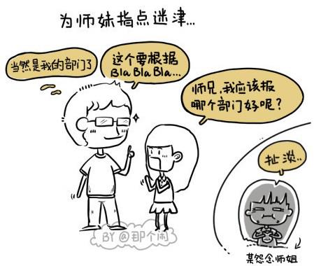 又到一年一度开学时,师兄开始不淡定了,师姐开始很纠结,因为一群可爱的师弟师妹新上架了。近日,网友@那个闲在微博上发表了“师兄师姐的那些事那些情”系列漫画,引起网友强烈围观和转发。