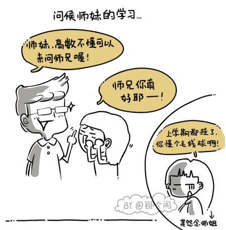 这里,我们就一起来看看@那个闲“师兄师姐的那些事那些情”系列漫画和“开学的亚历山大”吧!