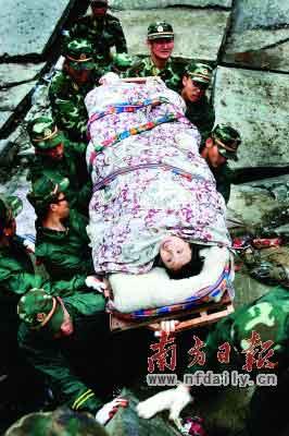 而在一片断壁残垣的北川县,在一片黑暗的废墟下,许多受困群众在不屈不挠地与死神作斗争,并最终赢得了生存的希望。